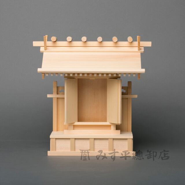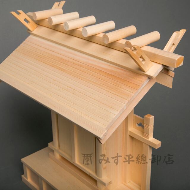 屋根の上には伊勢神宮と同じ様に千木(ちぎ)と勝男木(かつおぎ)も付け胴には脇障子も付いた一社宮の最上級モデルです。