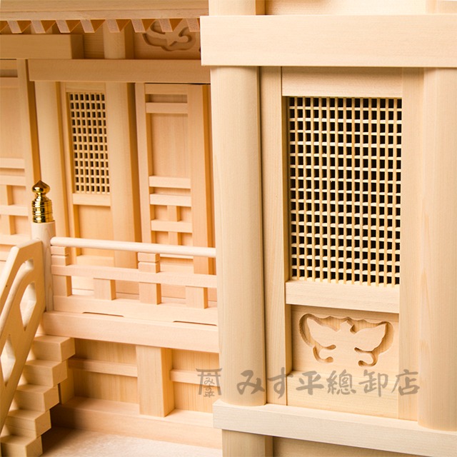 この商品は箱宮シリーズの標準型となります。階段や手摺も略さず付けた本格派で奥行きもありどっしりとした安定感のあるデザインとなっております。