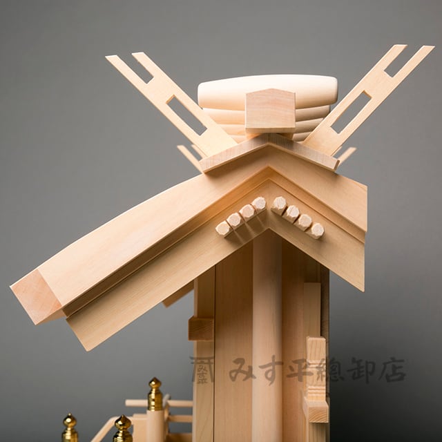 通常のお宮の土台部分が箱状なのに対してこの商品は神宮(伊勢神宮)と同じ様に束(縁束・えんつか)を立てて本物さながらの造りを出来るだけ再現してみました。