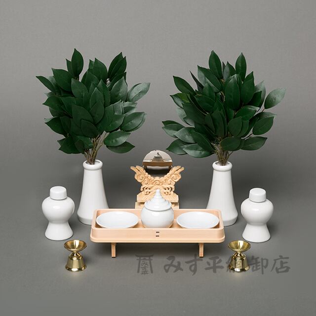 2尺祖霊舎用セット : 榊立 4寸、徳利 3寸、水玉 1.8寸、皿 2寸、長膳 7寸、神鏡(上彫) 2寸、ローソク立 大々 ※こちらの神具セットに造花榊は含まれません。